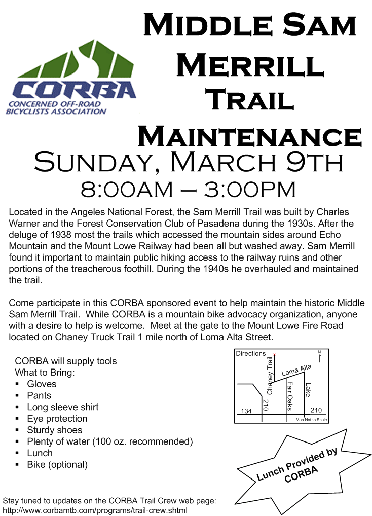 February 27, 2008 at 9:00 AM March 1 - MTB Skills Class March 9 - Trail Mantenance Middle Merrill Trail (flier attached) We will be working on the Middle Sam Merrill Trail. This is a heavilyused trail and is seeing some wear and tear. The trail is in need ofsome brush work. There are also several ruts on the trail that are getting bigger with all the rain we have received. We will createsome rolling dip water diversions to get the water off the trail.CORBA will provide a meal for the Crew after the work day is done. Bring snacks and water to carry with you on the trail. http://corbamtb.com/programs/trail-crew.shtml Raise Money For CORBA Programs Ralphs Club Card CORBA is now enrolled in the Ralph's Community Program. If you shop at Ralphs, you can support CORBA just by registering your Ralphs card. It's easy to set it up! Just visit www.ralphs.com and go to the Community link on the left-hand side of the web page. You can register your Ralphs card, or apply for a card online. Each time you make a purchase, CORBA will receive a small donation. Note: the form will ask for our Ralphs NPO number, which is 90320. Goodsearch.org Goodsearch.org is a grassroots search engine that donates a small amount (1-2 cents) to a charity of your choice each time you search. If even just 100 people use Goodsearch.org twice a day, that's about $730 raised for CORBA per year. The search engine that goodsearch.org uses is Yahoo. You can also click though their GoodShop affiliate program when you shop online with participating retailers for additional donations to CORBA or another charity of your choice. It's easy to log into or to set up on your tool bar. Once logged into www.goodserach.org, simply enter CORBA into the box where it asks "Who do yougoodsearch for." Check it out! LA City Bicycle Master Plan Update Workshops Please remember to join the City of Los Angeles for the Bicycle Master Plan Update workshops, to be held on: Wednesday February 20 - West Los Angeles 6:30pm Felicia Mahood Multi Purpose Center Wednesday February 27 - Valley Area 6:30pm Saturday March 1 - Harbor Area 10:00AM